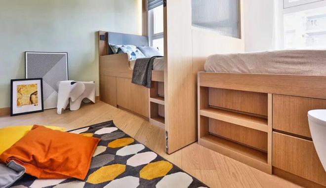 两张小床都是靠窗定制的,依然是箱体结构,内部有充足的储物空间。平时,次卧内的木框玻璃门是打开的状态,孩子们可以在一起玩游戏;到了晚上,他们会把床之间的门关闭,彼此互不打扰。