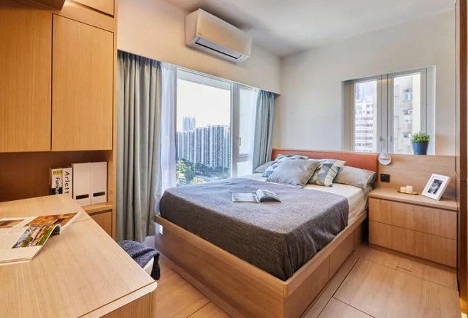 1.5米的宽的箱体床紧挨落地窗摆放,为另一侧留出充足的空间定制“衣柜+床头柜”;床板下方也有储物空间,用来收纳一家人的过季衣物和被褥。