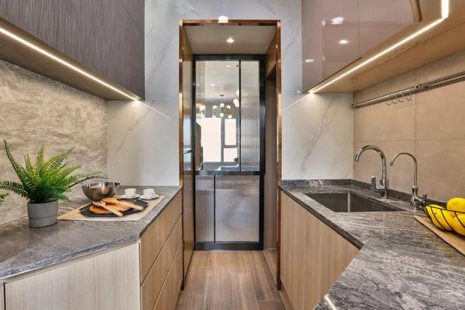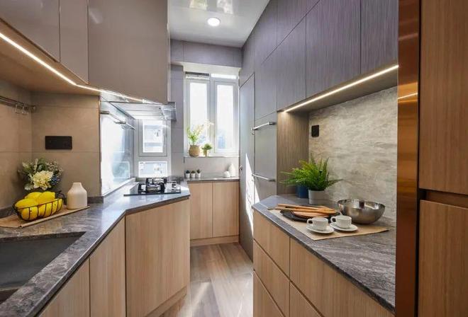 厨房两侧都定制了橱柜和吊柜,右侧吊柜在靠窗位置延伸至下方,自然形成了高柜,内部空间做了嵌入式冰箱、烤箱和蒸箱。